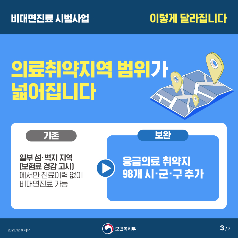 이와 함께 취약지역을 의미하는 '보험료 경감 고시'에 응급의료취약지역(98개 광역·군·구간)을 섬·벽지에 추가하고, 휴가·야간에는 진료이력에 상관없이 대면진료가 가능하도록 할 계획입니다.