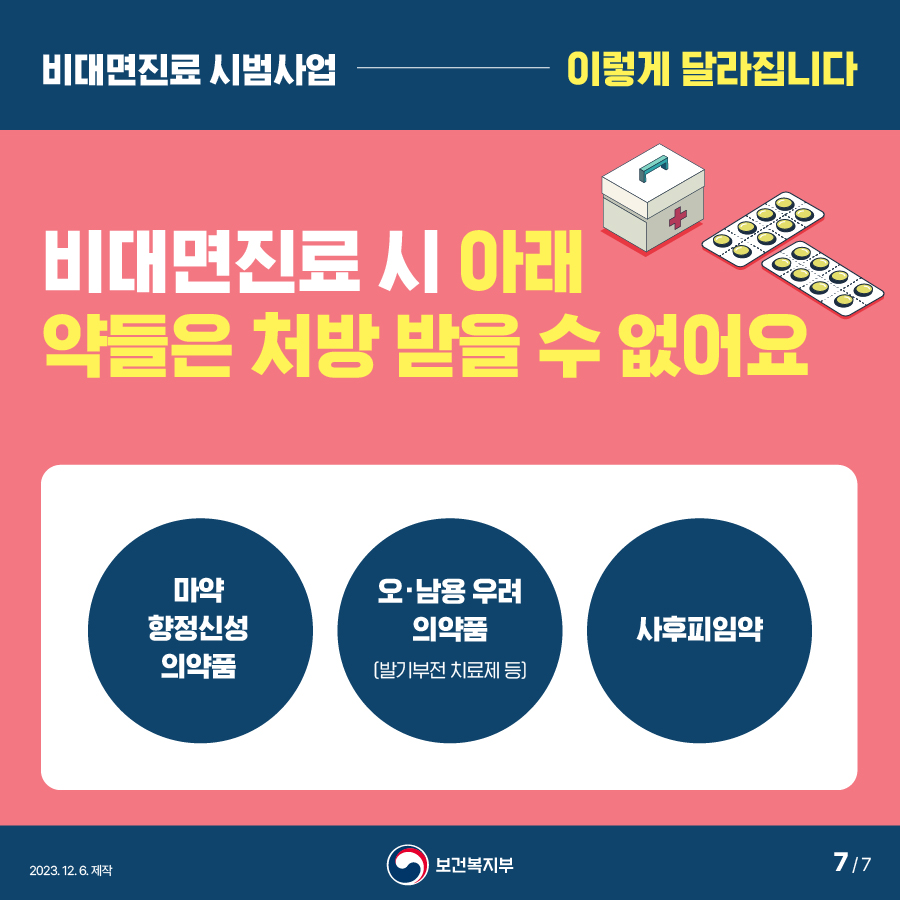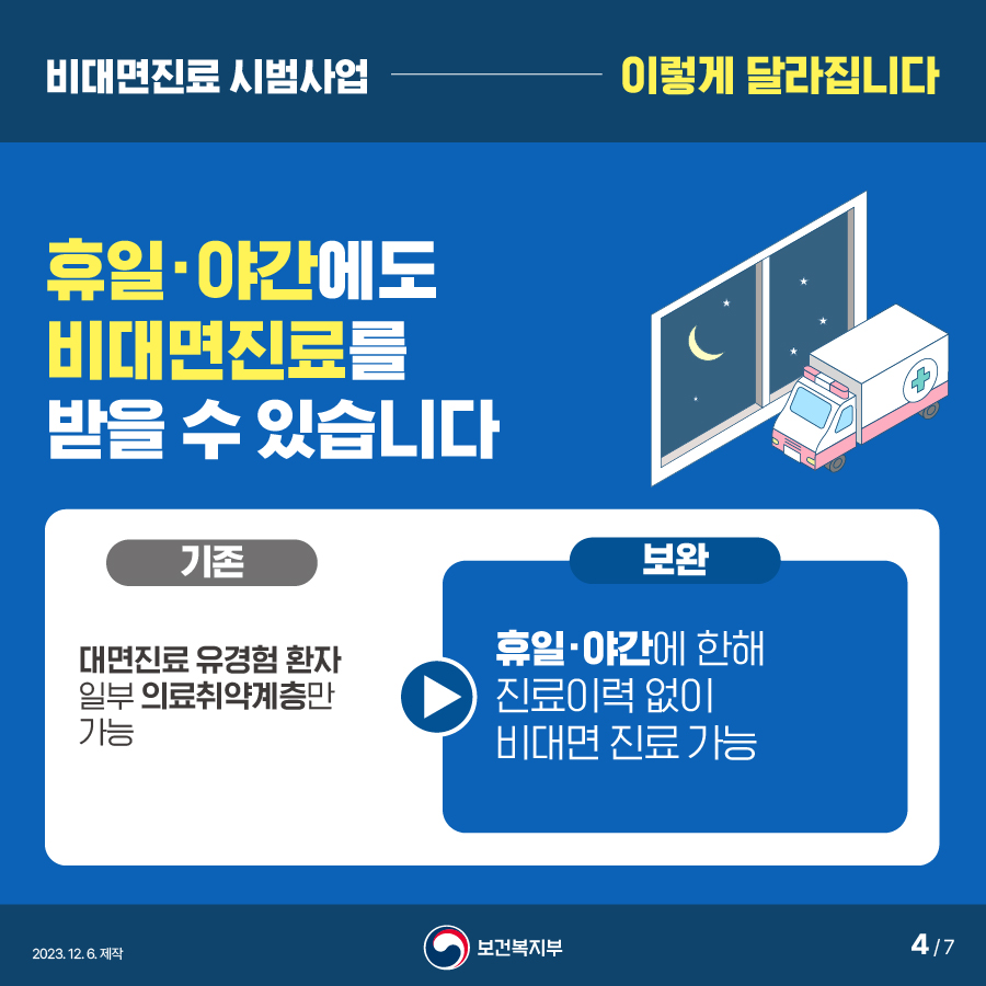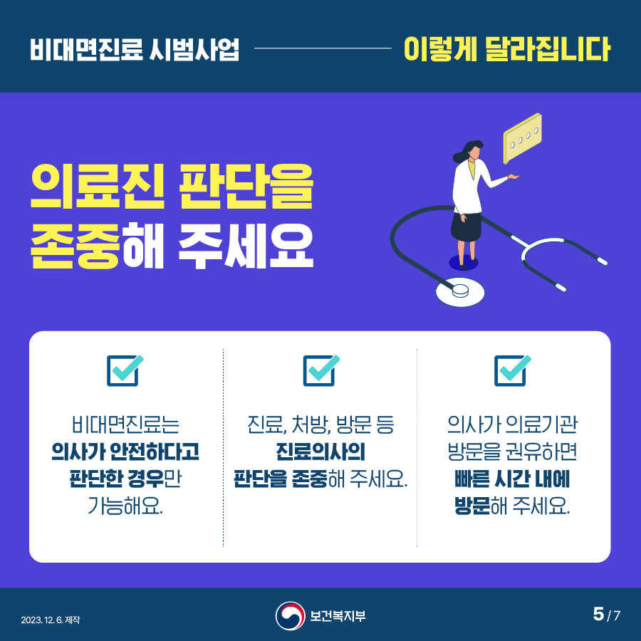 지난 6월 1일부터 한시적 비대면진료를 종료하고 비대면진료 시범사업에 돌입했는데요. 시범사업 6개월을 맞아 현장 의견을 바탕으로 「비대면진료 시범사업 자문단」 논의와 공청회 등을 거쳐 국민의 의료접근성 강화와 의료진 판단을 존중하는 방향성으로 보완했습니다.