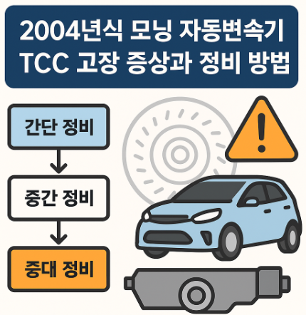 2004년식 모닝은 TCC 관련 고장 코드가 흔하게 발생합니다. 미션이 오래된 경우에는 초기에는 단순 오일 교환만으로도 개선될 수 있지만, 증상이 반복되면 솔레노이드·밸브보디 등 미션 정비가 필요할 수 있습니다. 이를 방치하면 결국 토크컨버터 교체 또는 미션 오버홀까지 이어질 수 있으므로, 체크엔진등 점등 → OBD 진단 → 조기 정비가 중요합니다.