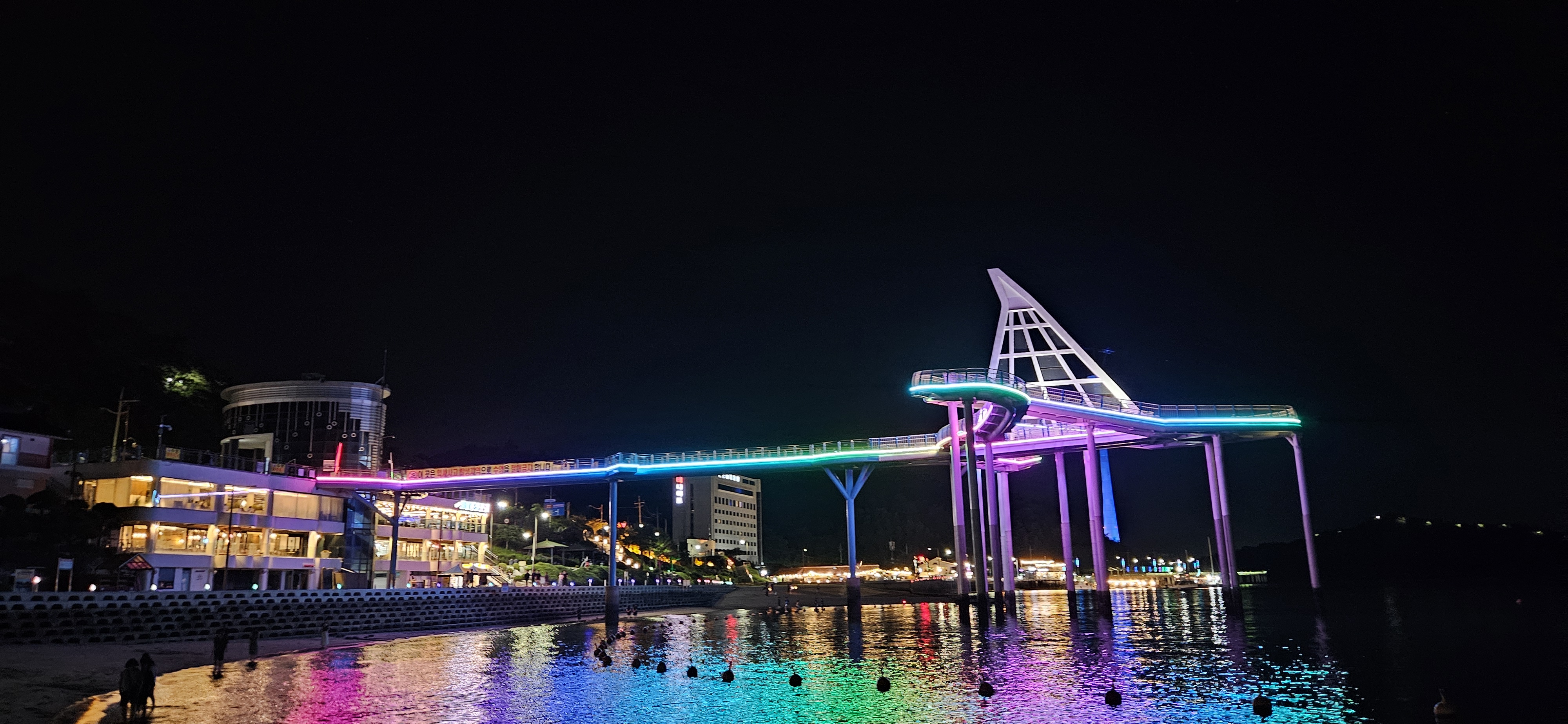 교각마다 반짝이는 조명이 물결에 흔들리며 반사되자, 마치 바다 자체가 별빛으로 가득 찬 것처럼 느껴졌습니다.