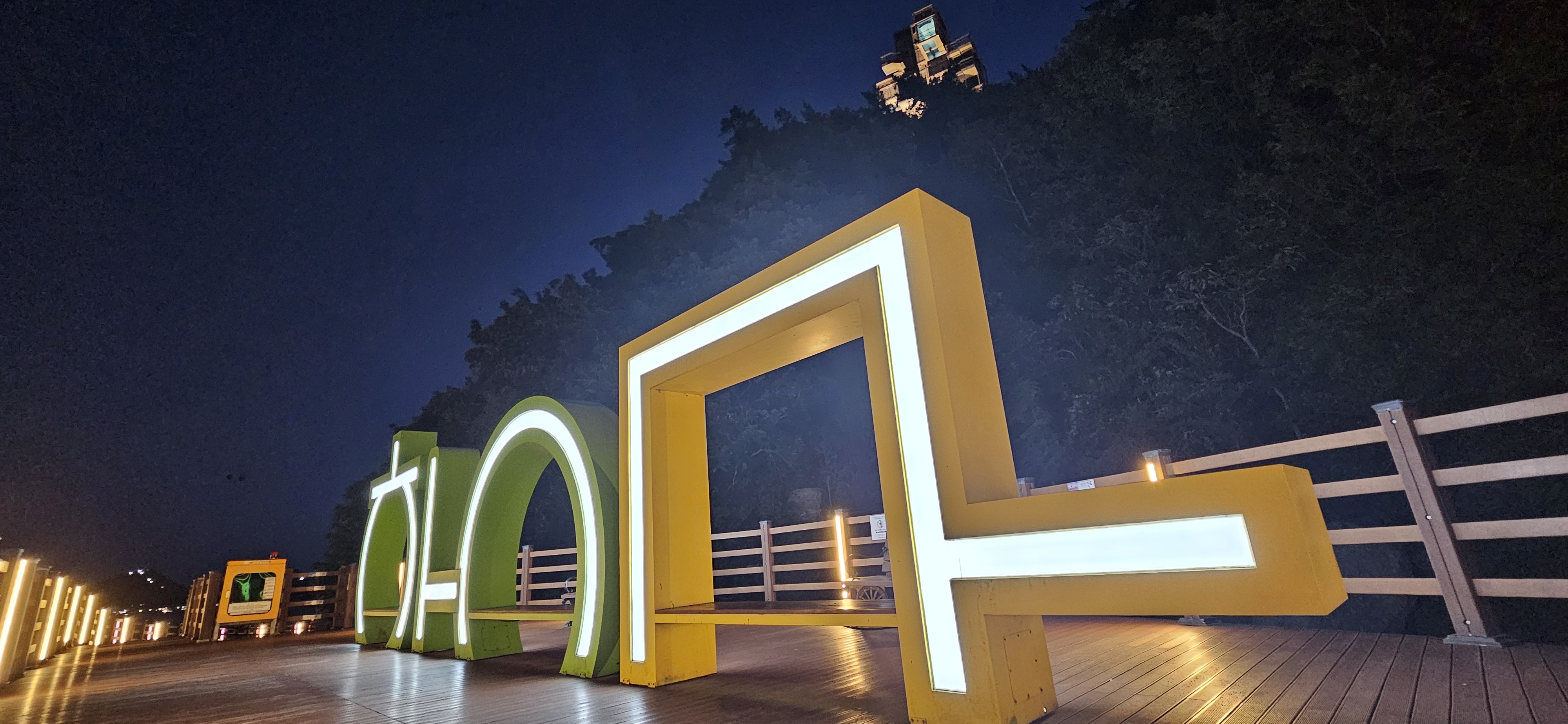 고하도 전망 포인트에 서니 정면으로는 유달산의 어두운 실루엣이 웅장하게 자리하고, 그 아래로는 유달공원의 불빛이 반짝이고 있었습니다.