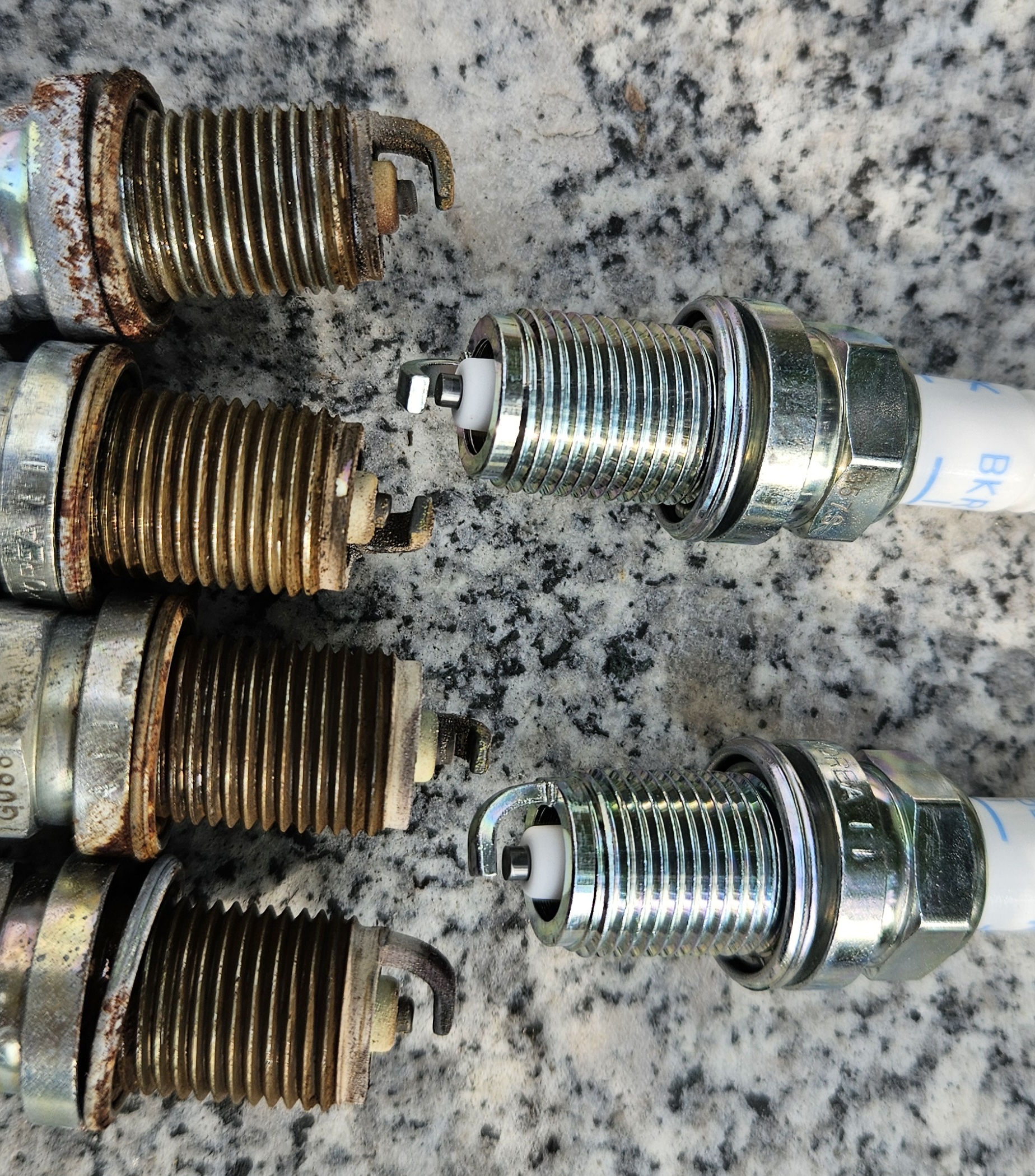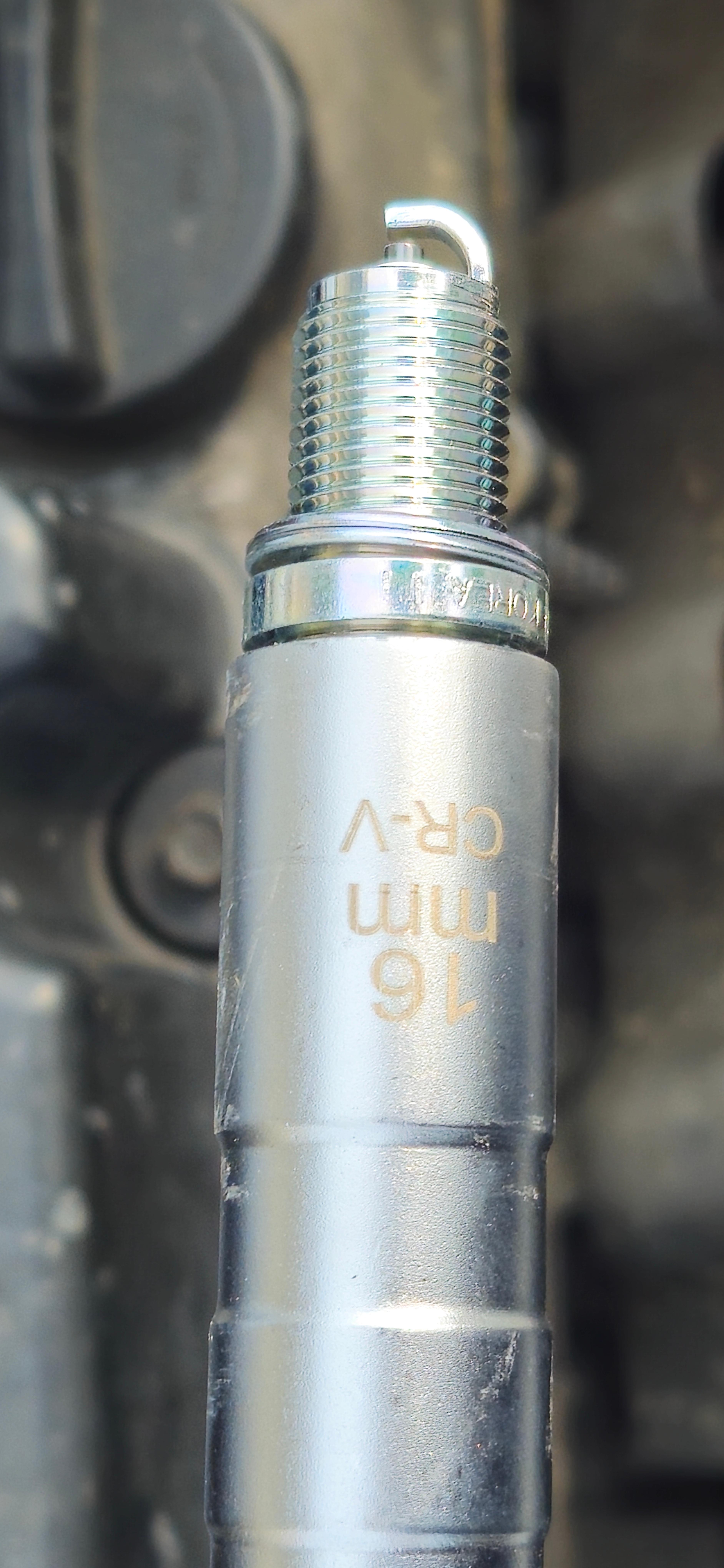 소켓 렌치를 사용해 시계 반대 방향으로 돌려주니 플러그가 빠졌습니다. 오래된 플러그는 전극이 많이 닳아 있었고, 탄화된 흔적도 보였습니다.