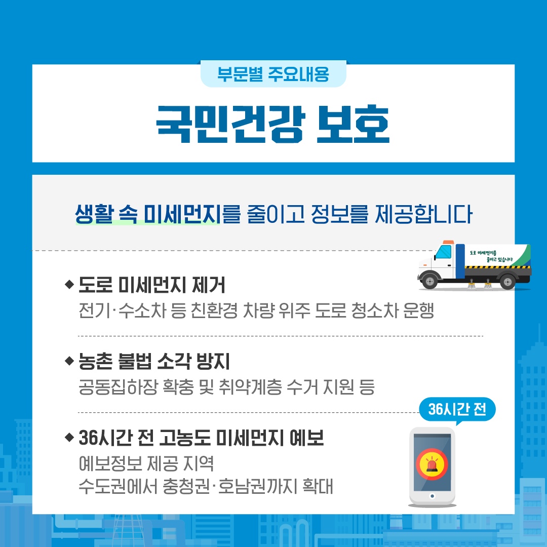 도로·공사장과 유사한 주거지 인근의 미세먼지 감축 조치도 집중적으로 시행해 교통량이 많은 도로는 도로청소차 운행을 늘리고 무공해 청소차 도입을 확대합니다.