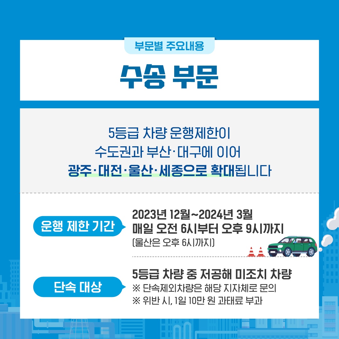 오는 12월 1일부터 미세먼지 저감을 위해 5등급 차량의 운행제한 지역을 확대 시행하고, 미세먼지 농도가 높아지는 겨울에는 매년 5등급 차량 운행제한을 시행하는데 특히 이번부터는 수도권과 부산·대구에 이어 광주·대전·울산·세종 등으로 운행제한을 확대 시행합니다.
