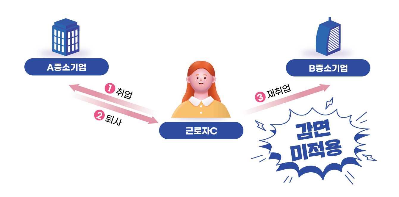 | 2010년부터 A중소기업에 근무하던 여성 근로자 C씨는 2020년 결혼을 하면서 회사를 그만둔 후 2023년부터 동종 업종을 영위하는 B중소기업에 재취업하였으나, 청년만 중소기업취업자 소득세 감면 혜택을 받을 수 있는 것으로 생각하여 소득세 감면신청을 하지 않음 ※2017년부터 감면대상자에 경력단절 여성 추가 |