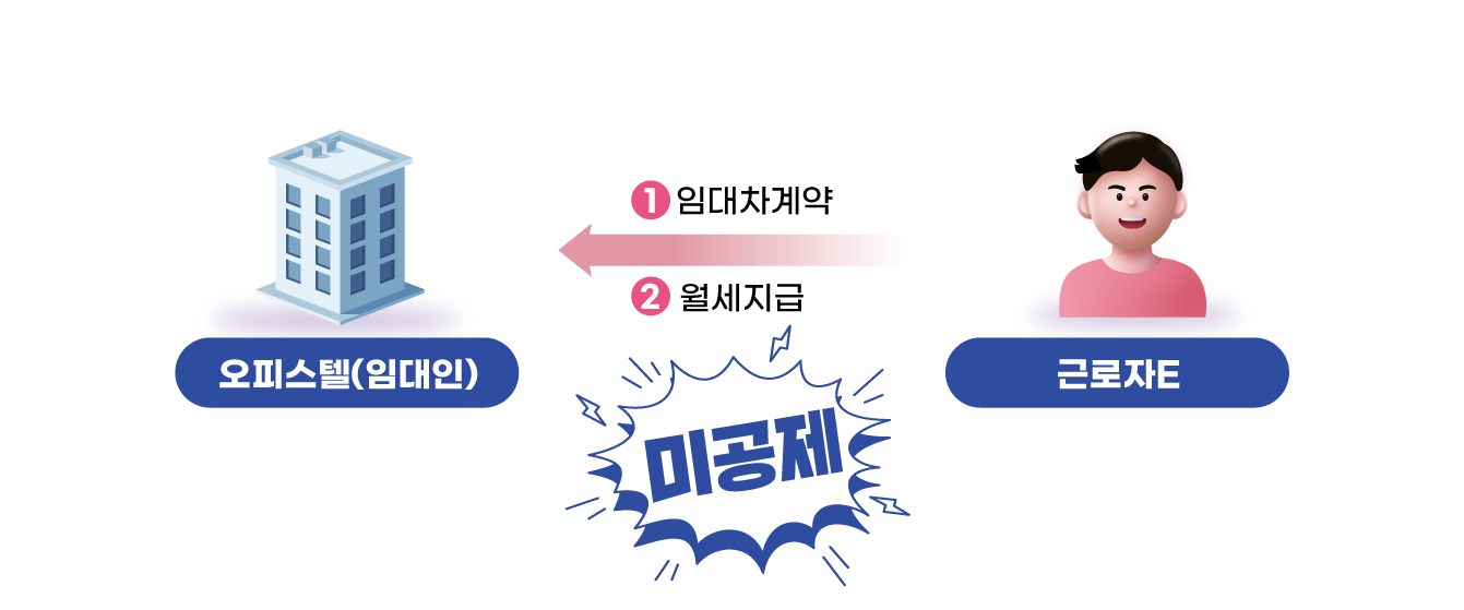 | E씨는 회사 인근 주거용 오피스텔에 거주하며 월세 50만 원을 지급하고 있으나, 오피스텔은 공제대상 주택이 아닌 것으로 판단하여 세액공제 받지 않음 |