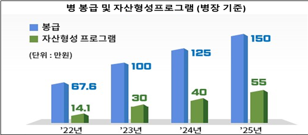 병 봉급은 병역의무 이행에 대한 적절한 처우와 보상이 요구된다는 국민적 공감대에도 불구하고 2022년까지 최저임금 에 크게 못 미쳤다. "병역의무 이행에 대한 국가 지원 강화'라는 국정과제를 이행하기 위해 2025년까지 봉급과 자산형성프로그램을 결하하여 병장 기준 월 200만원 수준으로 지원합니다.