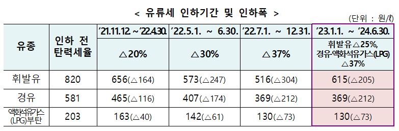 개정안은 중동위기 고조 등에 따라 국내외 유류 가격 불확실성이 여전히 지속되고 있는 점 등을 고려한 것이다. 이번 개정을 통해 인하 전 세율 대비 휘발유 △205원/리터(ℓ), 경유 △212원/리터(ℓ), 액화석유가스(LPG)부탄 △73원/리터(ℓ)의 가격 인하 효과가 향후 2개월간 유지되어 국민들의 유류비 부담 경감에 기여할 것으로 기대된다.