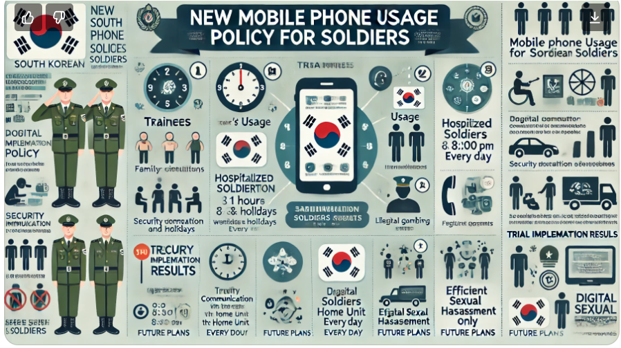 국방부는 병사들이 휴대전화를 사용할 수 있는 시간을 일과 후로 유지하면서, 훈련병과 군병원 입원 환자의 휴대전화 사용 정책을 보완하여 2024년 9월 1일부터 시행한다고 밝혔다. 이번 변경은 병사들의 휴대전화 사용을 더욱 효율적이고 실용적으로 개선하기 위한 조치라고 하였다.