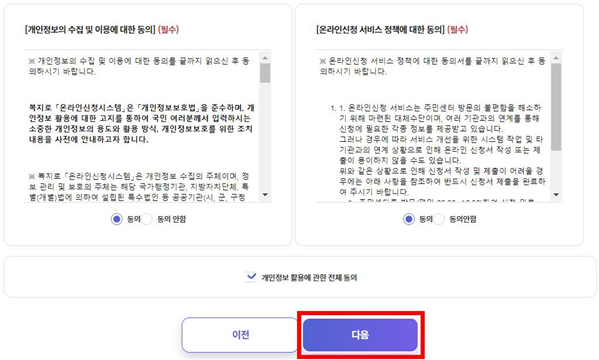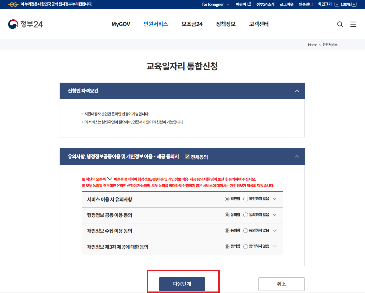 4) 교육·일자리 통합신청 → 유의사항, 개인정보 동의서 등 확인 → 다음단계