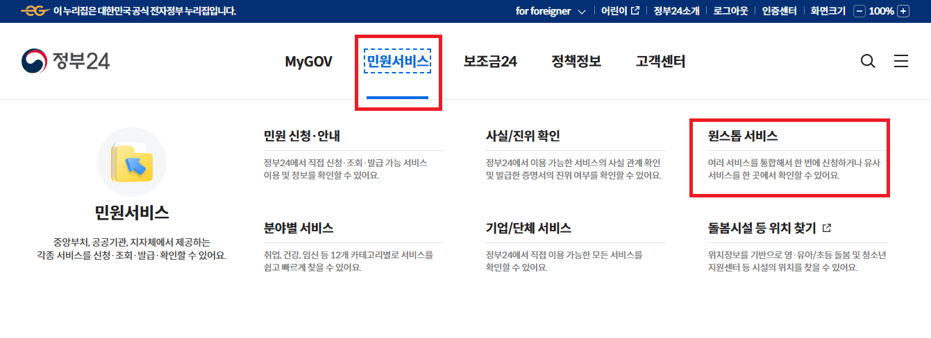 1) 정부24→민원서비스→원스톱 서비스