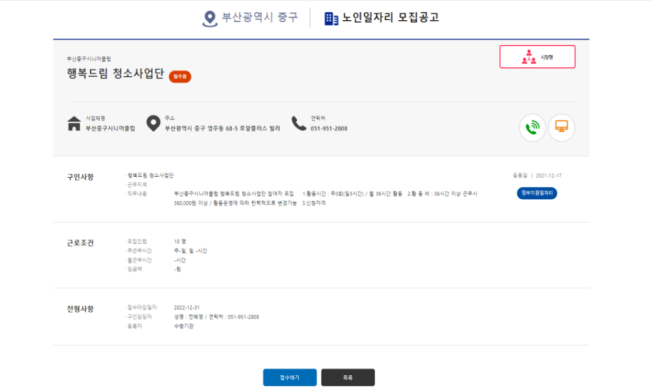 3) 원하는 일자리 정보 클릭 → 일자리 세부 정보 확인 후 ‘접수하기’ 클릭