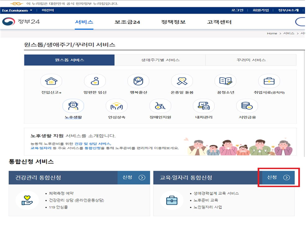 3) 통합신청 서비스→교육·일자리 통합신청→신청